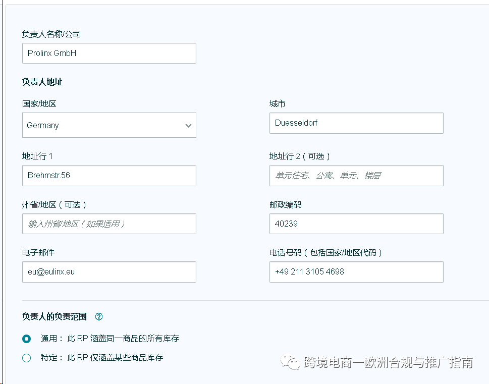 还需要注意的是,只要你的产品需要打CE标识,那么一定需要找这么一个欧盟授权代表。去哪里找呢?来找我们吧,德国欧通Prolinx是这方面专业的一手服务商,1年收费1999元,3年收费4299元,2个工作日办理完成。最近亚马逊在后台会给卖家开case,强制要求卖家提交欧代/合规负责人的信息,下面的截图就是找我们德国欧通Prolinx做欧代后填写的模板: