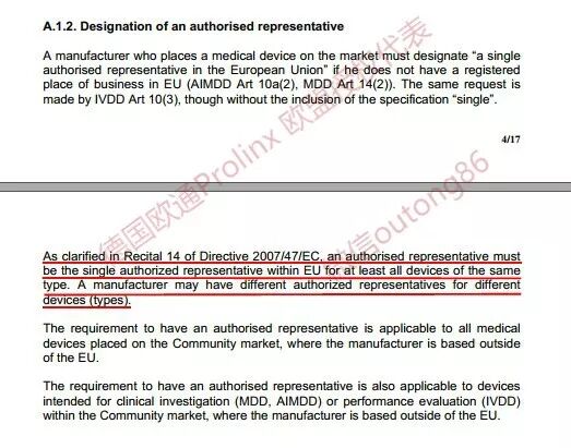 那么我们如何理解这个"唯一"呢?德国欧通Prolinx在医疗器械指令的修订版2007/47/EC中找到了答案,即:对于同一类产品,在欧盟地区只能有唯一的一个欧盟授权代表,但是对于企业的不同类的产品是可以有不同欧盟授权代表的。