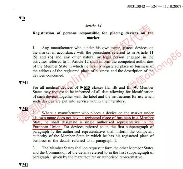 欧盟医疗器械指令MDD 93/94/EEC第14款第2条明确规定:如果制造商在欧盟当地没有注册营业地,那么这家制造商必须在欧盟地区指定一名唯一的欧盟授权代表。指令原文截屏如下,相关条款已用红色下划线标出: